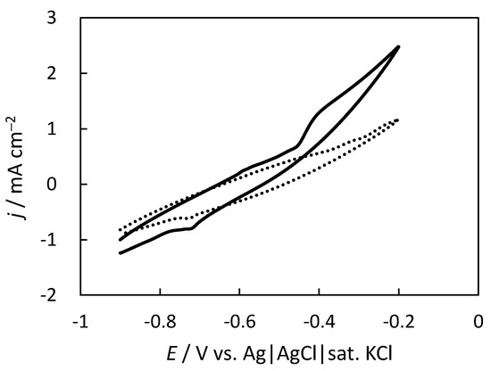 Figure 2 shows the cyclic voltammograms of an indigo-dye fermenting suspension at the CFE placed at the bottom of the cylinder-type container under quiescent conditions without deaeration with an inert gas (e.g., nitrogen or argon). The solid and dotted lines represent the cyclic voltammograms at room temperature (ca. 25 °C) and 0 °C, respectively. At 0 °C, there was practically no microbial catalytic activity; thus, the cyclic voltammetry (CV) curve at 0 °C is considered as a background wave encompassing the non-catalytic redox wave. The anodic broad wave around −0.5 V was assigned to the oxidation of leuco-indigo, and the small peak around −0.7 V was assigned to the reduction of indigo (that may be adsorbed on the CFE). The result was in good agreement with the redox potential of the indigo/leuco-indigo couple that was reported to be −0.65 V (at pH = 10.7) [27]. The positive shift of the onset potential of the leuco-indigo oxidation may be ascribed to the slow kinetics of leuco-indigo at the CFE. Since the O2 reduction wave was not observed, we can conclude that the bottom of the container remained anaerobic, even when the container was maintained under atmospheric conditions.