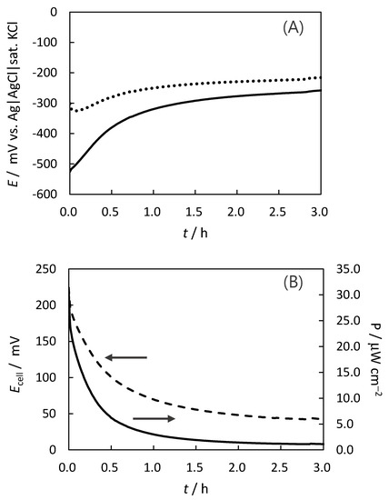 The stability of the biofuel cell was evaluated in a continuous operation. Panels A and B (Figure 5) show the time dependence of the anode potential (panel A, solid line), cathode potential (panel A, dotted line), cell voltage (panel B, broken line), and power density (panel B, solid line) during the continuous operation at a resistance of 2000 Ω. We selected this resistance since the biofuel cell exhibited the highest power density in the initial state. The power density decreased rapidly in 0.5 h and became very small (less than 2 µW cm−2) after 3.0 h. From the results of Figure 5, Panel A, we can conclude that the cause of the decline is the degradation in the performance of the anode. Concerning the cathode side, the potential shifted toward the positive side. This is because the current density decreased with the performance degradation of the anode.