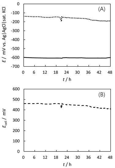 Conversely, a stability test with OCV measurements was also conducted. Panels A and B (Figure 6) show the time dependence of the anode potential (panel A, solid line), cathode potential (panel A, dotted line), and cell voltage (panel B, broken line) during the continuous operation at a resistance of 10 kΩ. The cell voltage decreased gradually, and after 48 h, it decreased by approximately 80 mV compared to the initial potential. For the long-term measurement (48 h), the state change of the gas–liquid interface, due to the evaporation, degraded the cathode performance. The spike-shaped noise at 22 h is due to the fine adjustment of the cylinder position to compensate for the decrease in the water level caused by the evaporation.
