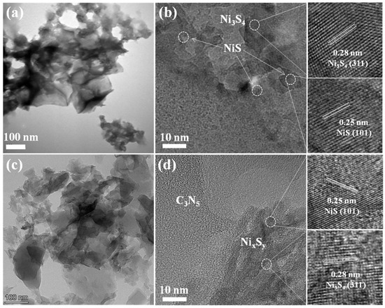 TEM and HRTEM images of NixSy (a,b) and 1.0 wt% NixSy-C3N5 (c,d).