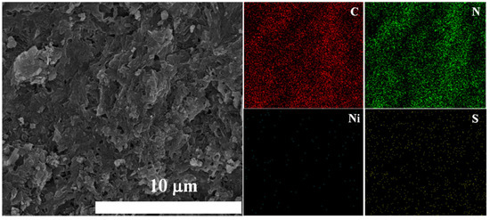 To further investigate the components of the hybrid, we performed scanning electron microscope (SEM) and Energy-dispersive X-ray spectroscopy (EDS) element mapping of 1.0 wt% NixSy-C3N5, as shown in Figure 3. As seen in the figure, NixSy-C3N5 exhibits the basic morphology of nanosheets, which is in good agreement with the results of TEM. In addition, the hybrid is composed mainly of C, N, Ni and S elements, and each element disperses uniformly in the observed region from the mapping images. The high dispersion of NixSy on C3N5 will be favorable for subsequent photocatalytic performance.