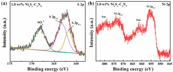 Figure 4 and Figure S2 show the XPS spectra of NixSy-C3N5 to determine the state of each element in the hybrid. As exhibited in the survey spectrum of Figure S2a, C, N, Ni and S are all observed in 1.0 wt% NixSy-C3N5, indicating the successful fabrication of the hybrid, which is in good agreement with the above results of XRD, TEM and SEM analyses. The regional spectra of C 1s and N 1s (Figure S2b,c) are similar to that of C3N5 in our previous work [27], and no obvious shift is observed for the corresponding peak position, revealing that the hydrothermal procedure for the NixSy-C3N5 preparation has no obvious influence on the structure of C3N5. The high-resolution XPS spectrum of S 2p is shown in Figure 4a, in which the peak at ~168 eV represents the residual sulfate group originating from the hydrothermal procedure. Two peaks at ~162.3 and ~163.1 eV corresponding to S 2p3/2 and S 2p1/2, respectively, are observed, demonstrating the existence of a metal-sulfur (Ni-S) bond and sulfur ion [30,31,32]. Two distinct spin-orbit peaks at ~855 (Ni 2p3/2) and 873 eV (Ni 2p1/2), along with two satellite peaks (identified as ‘‘Sat.’’), are observed in the high-resolution XPS spectrum of Ni 2p (Figure 4b), suggesting the existence of nickel ions in the NixSy-C3N5 hybrid [30,31,33]. These results further confirm that the NixSy-C3N5 hybrid was successfully constructed.