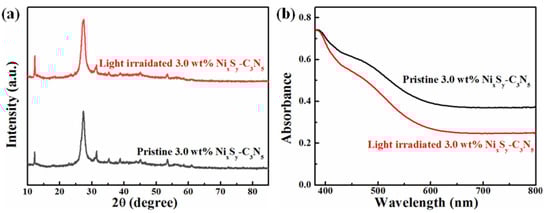 Comparison of (a) XRD and (b) DRS curves of pristine and light irradiated NixSy-C3N5.