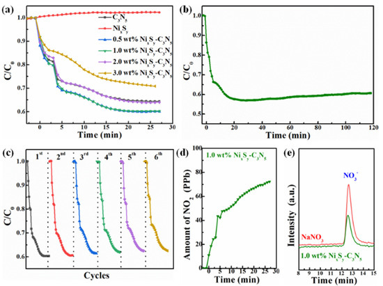 Figure 8a depicts the photocatalytic NO oxidation performance of NixSy-C3N5 and C3N5; quick removal of NO is observed, and the removal ratio reaches equilibrium during a short (~20 min) test in the continuous flow reaction system. The control experiment shows that no obvious activity for NO removal is observed on the pristine NixSy. The NO removal efficiency on pristine C3N5 is ~35%, which can be attributed to its wide light absorption property and suitable band position for O2 molecular activation and the generation of reactive oxygen species (ROS, such as •OH, •O2− and 1O2), which participate in the subsequent photocatalytic NO oxidation. Generally, the production of •O2− and 1O2 follows the equations of O2 + e− → •O2− and •O2− + h+ → 1O2 [11,38]. In addition, the production •OH follows the procedure of •O2− + 2H+ → H2O2 → •OH, since the VB position of C3N5 is more negative than the potential of •OH/H2O (2.38 V vs. NHE, pH = 0) according to our previous work [11,27]. The corresponding NO removal value can be improved to ~40% when 0.5 and 1.0 wt% NixSy are loaded on C3N5, which is much higher than that of the C3N4 materials (see Table 2) [39,40,41]. However, a decrease in NO removal efficiency is observed with a higher loading amount of NixSy (such as 3.0 wt%). It should be noted that excessive NixSy may cover the surface of C3N5 and then influence the light absorption by C3N5. The improved photocatalytic performance is related to the electron transfer between C3N5 and NixSy, as well as the enhanced efficiency for ROS generation, as will be discussed in the following section. The durability of 1.0 wt% NixSy-C3N5 on photocatalytic NO removal was tested under 2 h of light irradiation, as shown in Figure 8b; the removal ratio is maintained in the long-term test, revealing the excellent photocatalytic stability of NixSy-C3N5. The cycling performance of 1.0 wt% NixSy-C3N5 on photocatalytic NO removal is depicted in Figure 8c; there is only a slight decrease after six test runs, demonstrating the excellent photocatalytic repeatability of the present hybrid. Generally, the products of photocatalytic NO oxidation are considered to be NO2 and NO3−. The production of NO2 is directly recorded on the NOx analyzer shown in Figure 8d. For NO3− detection, the irradiated NixSy-C3N5 samples are re-dispersed in water and then filtered. Finally, the transparent filtrate is analyzed by ion chromatography with NaNO3 as a reference. As displayed in Figure 8e, the production of NO3− during NO removal is confirmed qualitatively. Notably, the selectivity for NO3− production is estimated to be ~70%, based on NO removal efficiency and residual NO2 amount (Figure 8a,d).