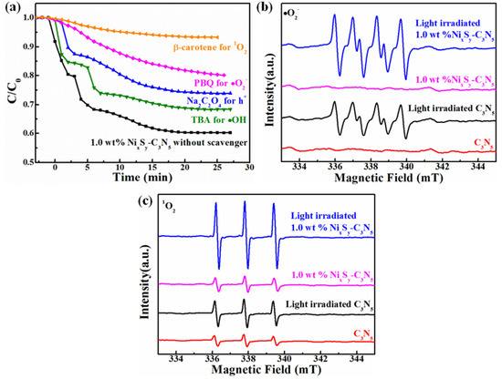 Generally, photogenerated h+ and the series of ROS play significant roles in the photocatalytic NO oxidation procedure. To explore active species that participate in the reaction of NO removal, a series of trapping agent experiments were conducted, in which Na2C2O4, tert-butanol (TBA), p-benzoquinone (PBQ) and β-carotene were used as scavengers for h+, •OH, •O2− and 1O2, respectively [42]. As can be seen in Figure 9a, the photocatalytic NO removal efficiency is inhibited to different extents when different trapping agents are added, demonstrating that all of the above-mentioned species can participate in the procedure for NO removal. In addition, the dominant species are •O2− and 1O2, since the NO removal efficiency is greatly inhibited when the two species are captured. Electron spin resonance (ESR) spectra were recorded to monitor the formation of the main active species of •O2− and 1O2. As revealed in Figure 9b,c, characteristic signals for DMPO-•O2− and TEMPO (product of TEMP oxidized by 1O2) were detected [42,43,44], and the signal intensity for NixSy-C3N5 was higher than that of pristine C3N5 under light irradiation, demonstrating that greater amounts of ROS can be generated on the NixSy-C3N5 hybrid. The result of the EPR analysis is in good agreement with the results of the photocatalytic performance.