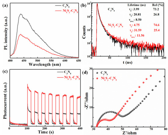 Comparison of steady-state (a) and time-resolved (b) fluorescence spectra as well as photocurrent-time (c) and EIS (d) behaviors of C3N5 and NixSy-C3N5.