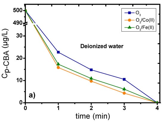 The catalytic activity of Fe(II) and Co(II) against p-CBA at pH 7.8 in deionized and dechlorinated natural potable water is presented in Figure 1a,b respectively, and the results are compared to those of single ozonation. Both Co(II) and Fe(II) can be characterized as catalysts when the reaction is taking place in deionized water, as Figure 1a shows, and that can occur independently of the pH value, as previous research has shown [11]. However, in water matrixes, also containing several scavenging compounds, such as in the dechlorinated natural potable water, the addition of Co(II) presented a negative result, regarding the p-CBA removal. In deionized water, ozone decomposed very fast (under 15 min), as shown in Supplementary Figure S1a, while in natural potable water, when Co(II) was introduced into the system, the reaction of ozone decomposition lasted for 100 min, instead of 60 min during the single ozonation and catalytic ozonation with the use of Fe(II) as a catalyst (Supplementary Figure S1b). Furthermore, the amount of ozone decomposed is not correlated with the amount of removed p-CBA in the same manner for all the examined reactions.