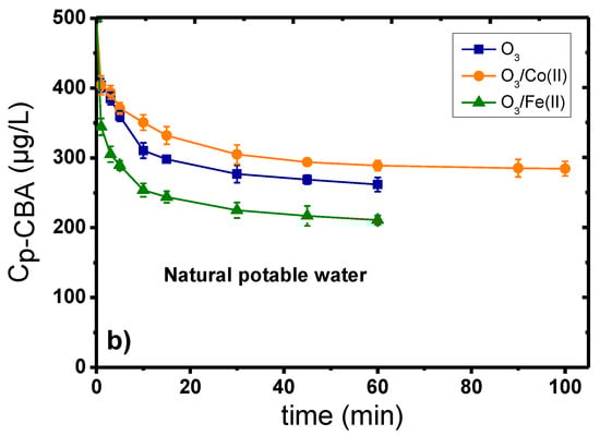 Catalytic ozonation of p-CBA with the use of Fe(II) and Co(II) as catalysts in (a) deionized water, and (b) dechlorinated natural potable water. Experimental conditions: initial p-CBA concentration 500 μg/L, ozone concentration 2 mg/L, catalyst concentration 1 mg/L, pH 7.8, temperature 23 ± 2 °C.