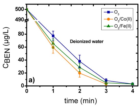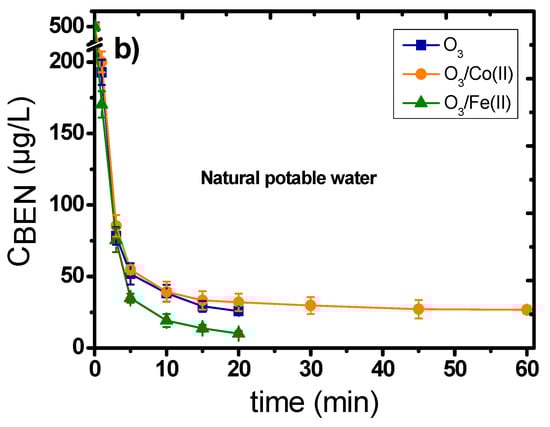 The same results were obtained from the benzotriazole removal study (Figure 2), which is a micropollutant of moderate ozone reactivity, in contrast to p-CBA, which (as previously mentioned) is practically unable to react with ozone [12]. In deionized water, benzotriazole can be easily removed even by the application of single ozonation, while the presence of both Fe(II) and Co(II) can slightly increase the oxidation efficiency of ozonation(Figure 2a). On the contrary, in the experiments with dechlorinated natural potable water, only Fe(II) presented catalytic activity against benzotriazole, and its removal rate reached 98% after 20 min of the oxidation process.
