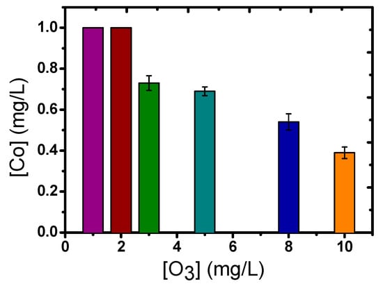 Therefore, the absence of any solid phases (precipitates) in the treated solution containing cobalt suggests that Co(II) was not oxidized towards its trivalent form. Figure 3 shows the remaining cobalt concentration in the solutions after treatment, according to the initial ozone concentration. When 1 or 2 mg/L were added in the ozonation system, no precipitation was observed, while an increase of initial ozone concentration up to 3 mg/L seems capable to oxidize Co(II) into Co(III), according to reaction 2. After the filtration (using a 0.22 μm filter), the residual concentrations of Co(II) in the aqueous solution under treatment, when 3, 5, 8 and 10 mg/L O3 were applied, were found to be 0.73, 0.69, 0.54 and 0.39 mg/L, respectively. Therefore, under such conditions, even the addition of 10 mg/L of ozone was not capable to completely oxidize Co(II), and subsequently, to remove it as a precipitate.