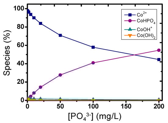 Cobalt in its trivalent form occurs in the aqueous solutions as Co(OH)(II), as presented in Supplementary Figure S4, and as Yuan et al. [25] observed. At pH 7.8, the Co(III) can be precipitated in water with or without the presence of phosphates, and its soluble form remains as the trivalent one, unaffected by the presence of PO43− in the solution. On the other hand, the divalent form of cobalt reacts with phosphates. Figure 4 shows the distribution of respective aqueous species in the experimental conditions of the study, when cobalt is in the divalent form, according to the concentration of phosphate ions in the solution. The data of cobalt species distribution were obtained from the Visual MINTEQ v.3 software. The percentage of CoHPO4 increases with the increase of phosphate concentration in the treatment system. When the concentration of PO43− is higher than 150 mg/L, the percentage of CoHPO4 is higher than that of Co(II) in the solution at pH 7.8. Simultaneously, in the presence of phosphates, Co(II) can also be precipitated, according to reaction 3, and a lower concentration of Co(II) remains in the solution [26]:
