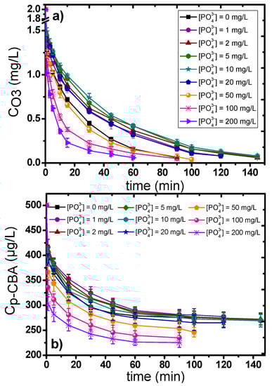 When Co(II) is fully oxidized towards Co(III), the addition of phosphates into the solution should present a negative effect on the oxidation reaction and on the catalytic activity of cobalt [27]. The kinetic curves of ozone decomposition in the presence of phosphate ions and for different initial concentrations, ranged between 1 and 200 mg/L, are shown in Figure 5a. These results are compared to those of the Co(II)/O3 oxidation system, but without the addition of PO43−. According to MINTEQ software (version 3.0), and for the studied conditions, the phosphate ions occur in the aqueous solution mainly as HPO42−, but the H2PO4− ions can also be identified. From these experiments, it was observed that the increase of phosphate ions’ concentration decelerates ozone decomposition (Figure 5a). According to Hoigné et al. [28], the reaction rate constants of hydro- and dihydro-phosphate ions with the hydroxyl radicals are 2 × 104 M−1 s−1 and 1.5 × 105 M−1 s−1 respectively, according to reactions 4 and 5. The p-CBA organic compound reacts faster with the hydroxyl radicals (the respective constant is 5.2 × 109 M−1 s−1 [14]); thus, the phosphate ions can be considered as scavengers for ozone decomposition, although not very strong ones.