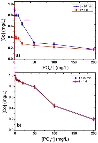 Additionally, the formation of precipitate was observed in these experiments. The only precipitate that can be formed between Co(II) and PO43− is Co3(PO4)2, according to the Visual MINTEQ version 3.0 software. The formation of Co3(PO4)2 depends on the concentration of phosphates, and its production is increased by the increase of phosphate ions’ concentration. When the phosphate ions were added into the system in relatively lower concentrations, less precipitate was formed. The ions remained free in the solution, because even CoHPO4 (i.e., the respective soluble form) can be formed at the lower percentages, as shown in Figure 4. However, following the addition of higher PO43− concentrations, the cobalt precipitation was increased. Additionally, the observed precipitation procedure is being continued and increased over time. However, in the presence of phosphates, Co(OH)3 can also be formed, due to the fact that the presence of phosphates favors to some extent the oxidation of Co(II) into its trivalent form, in comparison to the results of Figure 3. Therefore, Figure 6a shows the percentage of Co(II) oxidized by ozone and precipitated as Co(OH)3/Co3(PO4)2, while Figure 6b shows the residual Co(II) concentration, as a result of the solubility product constant (Ksp). Nevertheless, the increase of phosphates’ concentration implies a decrease in the solubility of Co(II). After a period of 24 h in an oxidizing environment, the oxidation rate of Co(II) is increased in comparison to the 90 min examined ozonation period. The rest of the soluble Co(II) concentration is reduced according to phosphates’ concentration. However, the soluble concentration at 200 mg/L was the same as the corresponding concentration in the ozone-free system, which is directly related to the respective Ksp value.