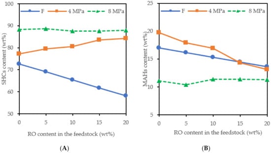 The DAHs and TAHs were hydrogenated to monocyclic aromatic hydrocarbons (MAHs) and these were partially converted to saturated hydrocarbons (SHCs) (Figure 2), mainly at 8 MPa. The content of SHCs in the products was higher compared to the corresponding feedstock also due to the conversion of the RO to alkanes. At 4 MPa, the content of SHCs increased and the content of MAHs decreased with an increasing RO content in the feedstock. At 8 MPa, a higher SHC content was achieved than at 4 MPa, but the SHC content did not increase with an increasing RO content in the feedstock.