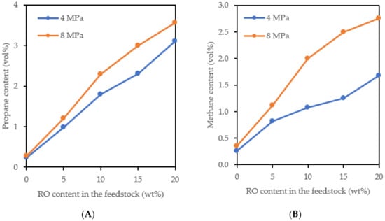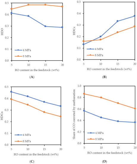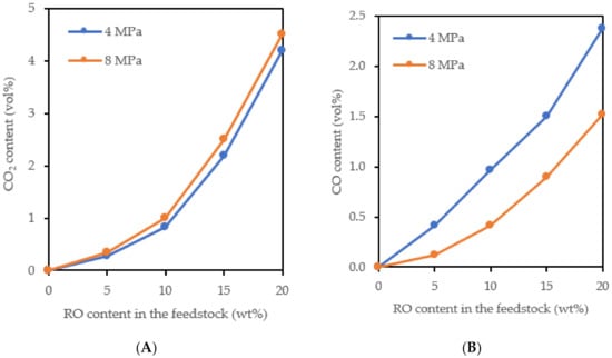 The increasing amount of methane depending on the increasing amount of RO in the feedstock (Figure 3B) was caused by the methanation of CO, the methanation of CO2 probably did not occur under the used reaction conditions [14,15,16]. The methanation reaction is promoted by increasing pressure, so the amount of methane in the products obtained at 8 MPa was higher than in the products obtained at 4 MPa. The greater extent of the methanation and hydrogenation of the aromatics (Figure 1 and Figure 2) at 8 MPa resulted in greater consumption of hydrogen. The volume of gaseous products decreased and this led to an increase in the content of propane and methane in the gaseous products (Figure 3). The CO content in the gaseous products obtained at 8 MPa was lower than in the products obtained at 4 MPa, which was largely due to its methanation (Figure 4).