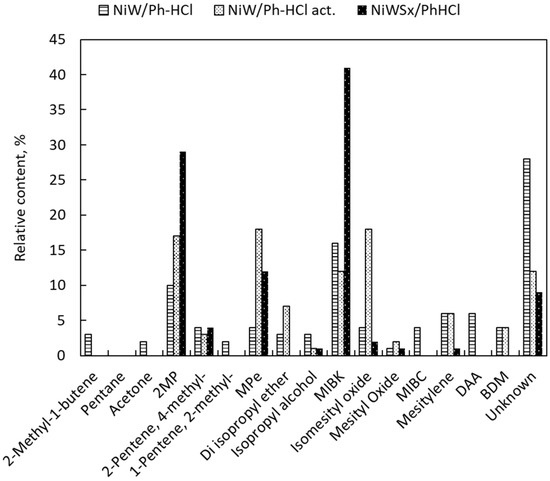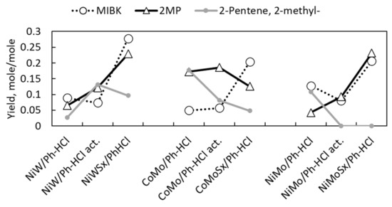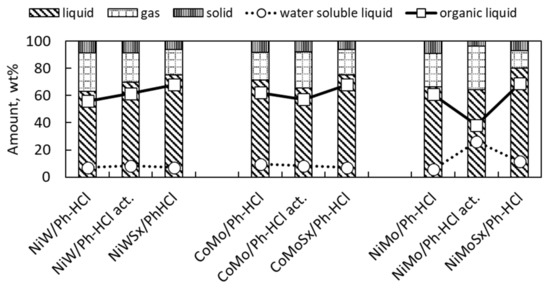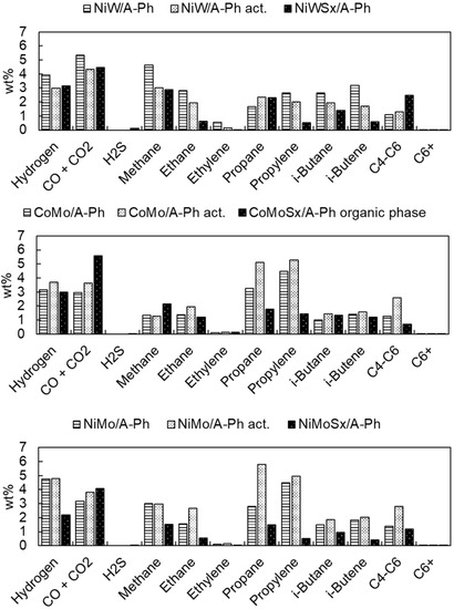 - For the activation by the active metal sulfidation, the metal oxide-supported catalysts were activated—sulfided using di-t-butyl polysulfide (Lubrizol Company, Wicklie, OH, USA). In total, 2.1 g of the catalyst and 10 g of di-t-butyl polysulfide were introduced into the reactor. The reactor was pressurized to 50 bar and heated from room temperature to 375 °C (8.3 °C min−1) while maintaining the temperature for 1 h. The reactor was then cooled to room temperature and depressurized.