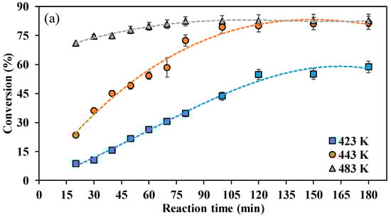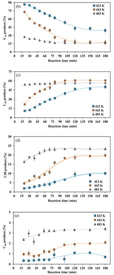 Figure 1 shows the process performance of the oligomerization reaction in terms of 1-decene conversion and product composition profiles with time at three different temperatures (423, 443 and 483 K) over the HY zeolite catalyst under microwave irradiation. As shown in Figure 1a, for any given reaction temperature, the conversion of 1-decene increased with time and reached a maximum level at high reaction time. For any given reaction time (lower than 120 min), an increase in reaction temperature significantly enhanced the conversion of 1-decene. This result corresponded well with our previous investigation on the 1-decene oligomerization [,]. The higher the reaction temperature, the shorter the reaction time to reach the highest conversion of 1-decene. Highest conversion of 1-decene at 423 K with reaction time greater than 150 min was 58.5%. Conversion increased to around 82% when reaction temperature increased from 423 to 443 K. With further increase in reaction temperature from 443 to 483 K, maximum conversion of 1-decene appeared unchanged. As shown in Figure 1b, 1-decene concentrations for all three reaction temperatures exhibited opposite trends to 1-decene conversions, as explained later by the activation energy values.