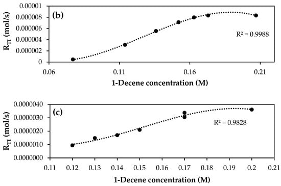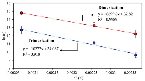 The Arrhenius equation was used to find the activation energy of the oligomerization reaction over the HY zeolite catalyst under microwave radiation. The rate of reaction was calculated from the production rate of dimer and trimer found by taking derivative of the dimer and trimer as a function of reaction time. The activation energy of the oligomerization of 1-decene over the HY zeolite catalyst was calculated from the slope of the Arrhenius plot, as shown in Figure 2. The y-intercept of the plot represented the pre-exponential factor. Calculated activation energy values were 70.8 ± 0.8 kJ/mol for the dimerization reaction and 83.6 ± 0.9 kJ/mol for the trimerization reaction. These values were lower than for the oligomerization of isoamylene over acidic resin catalysts [,] and a H-MRI zeolite catalyst []. Activation energy value of the ethylene oligomerization reaction over a Chevron Phillips catalyst was reported as 99.1 kJ/mol [], and very close to the calculated values in this study. Activation energies of 21 ± 0.5 and 33 ± 0.6 kJ/mol for the dimerization and trimerization of 1-decene over a tungsten-zirconia catalyst were lower than results in this study, corresponding to higher concentration of acidity on the tungsten-zirconia catalyst surface compared with the zeolite catalyst [,,]. Lower activation energy can also result from a reaction where the reactants have lower stability than the product [].