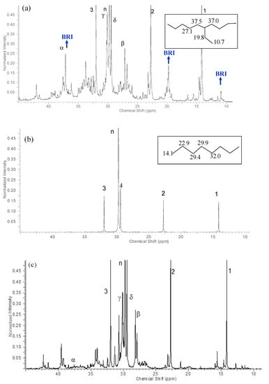 The C13-NMR spectrum of (a) the oligomer product obtained from the oligomerization experiment operated at a reaction temperature of 483 K and a reaction time of 180 min, (b) standard linear hydrocarbons in the range of C12 to C18 and (c) a conventional poly-alpha-olefin lubricant oil (PAO) where BRI is a branch hydrocarbon at any carbon location.