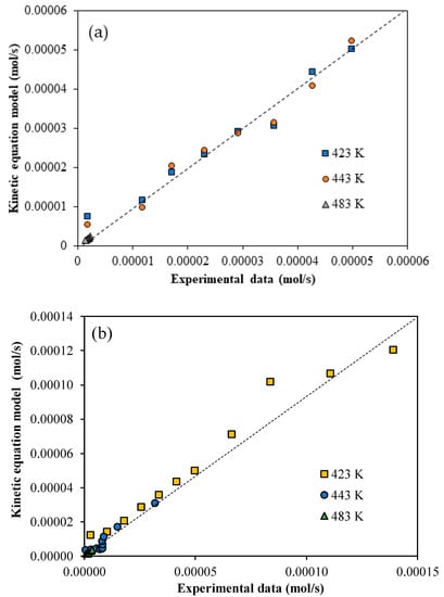 Figure 5 shows the comparison between the kinetic constants calculated from the best fit models and those from the experimental data. This figure indicates high validity of all formulated kinetic models except for the case of the trimerization reaction at 423 K, the formulated model to show a significant deviation from the actual values. The plots between the reaction rate constants obtained from the experimental data and those calculated from the proposed models for the dimerization and trimerization reactions showed the R2 values close to 1, indicating the validity of the proposed models as shown in Figure 6 and Figure 7.