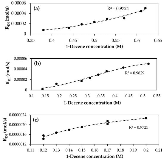 According to the lowest ∆AIC value corresponding to the best fit model, was the best kinetic model, reflecting dominance of the dimerization reaction at reaction temperature of 423 K and neglecting the vacant sites. This result was in good agreement with a previous investigation []. Increase in temperature beyond 423 K resulted in a significant increase in the reaction rate of trimerization, as previously mentioned. At reaction temperature of 443 K, the best fit model was , confirming that the concentration of vacant sites on the catalyst was negligible. The dimer adsorption equilibrium was also omitted from the kinetic model equation. At reaction temperature of 483 K, the best fit model was , also confirming that the higher the reaction temperature, the higher the activity of trimerization at the expense of dimerization. It was not physically possible for the oligomerization reaction to proceed with a relatively large number of vacant sites at high temperature because increasing temperature promoted the formation rate of the trimer. The trimer had high affinity toward an acidic site, resulting in rapid vacant site attachment to subsequently form coke []. Therefore, the reaction model of was reasonable to use instead of the model due to a low ∆AIC value of 1.34. The effect of reaction temperature in this investigation was in good agreement with previous research []. Significant reduction in the dimer adsorption equilibrium constant was also observed in previous research [] as reaction temperature increased beyond 423 K. The selected kinetic model for the dimerization reaction of decene is shown in Equation (1).