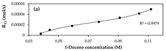 All reaction rate equations were formulated by assuming that the number of free active sites was small compared to the occupied sites; therefore, the free active sites could be neglected. The two main dimerization reaction rate equations are shown in Equations (10) and (12). With the same assumptions, there were four potential groups of possible trimerization reaction rate equations, as shown in Equations (13) to (18).