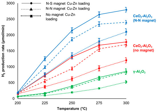 The effects of magnetic inducement during Cu-Zn loading were studied on γ-Al2O3 reference support and CeO2-Al2O3 supports prepared under different magnetic environments. Figure 1 shows the hydrogen production rates of Cu-Zn catalysts loaded with and without magnetic inducement on three supports, which are γ-Al2O3, CeO2-Al2O3 (no magnet), and CeO2-Al2O3 (N-N). The results from Cu-Zn catalysts on the CeO2-Al2O3 (N-S) support were omitted to avoid overcrowding the figure. They can be found together with the results from other supports in Tables S3–S6 in Supplementary Materials.