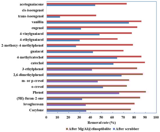 Comparison of removal rates for each tar compound in the syngas that passed through the water scrubber and Mg/Al-LDH@clinoptilolite.