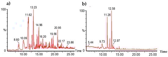 TIC (Total Ion Chromatogram) of quantified compounds in wood tar wastewater with internal standards from SPA sampling (Y-axis: Relative intensity). Tar species and content ratios in syngas: after passing through (a) water scrubber column and (b) Mg/Al-LDH@clinoptilolite.