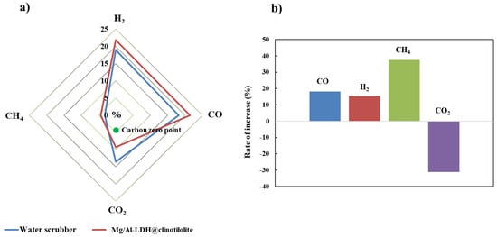 Change in content of H2, CO, CH4, and CO2 in syngas for which tar removal was performed by passing through the water scrubber and Mg/Al-LDH@clinoptilolite column (a): composition ratio %, (b): rate of change %.