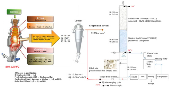Therefore, in this study, clinoptilolite, a natural zeolite that is inexpensive and easily excavated from open-air mines in Korea, and the corresponding Mg/Al-LDH@clinoptilolite have been utilized for the efficient removal of tar components that cannot be removed using conventional water scrubbers. Enhanced removal of CO2 and dehydration of syngas have also been achieved. The effectiveness of clinoptilolite was thoroughly demonstrated by the results obtained in this study.