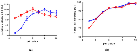 (a) Comparison of specific activities and (b) of regioselectivities at a linoleic acid concentration of 1 mM in dependence of pH-values with ☐ = soy flour suspension and ○ = LOX-1 obtained from Sigma Aldrich (peak assignment of regioisomers is shown exemplarily in Figure S1).