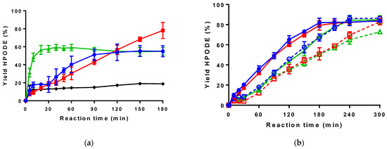 The hydroperoxidation with LOX-1 dosage yielded >83% hydroperoxides within 5 h at a safflower concentration corresponding to up to 100 mM linoleic acid (Figure 4b). In combined lipase-LOX-1 systems previously reported [26,37], larger amounts of enzyme (up to 150% w/w of lipase and 25% w/w of LOX-1) had to be used and solvent was needed for lipase accessibility. The hydroperoxide yields at 100 mM linoleic acid concentration were approximately 4 times lower than in our reaction system. Largely, these higher yields can be attributed to the utilization of green surfactant Triton CG-110 and the implementation of a LOX-1 dosage strategy.
