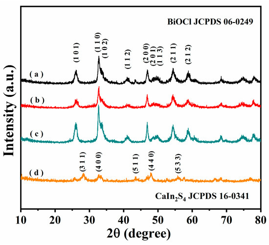 XRD patterns of (a) pure BiOCl, (b) BOC-SOVs, (c) 1% CIS/BOC-SOVs, and (d) pure CaIn2S4.