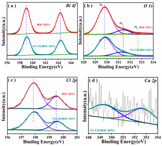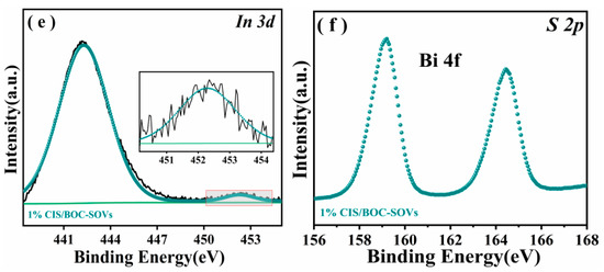 The composition and surface valence state of the as-synthesized catalysts are investigated by XPS (Figure 2 and Figure 3). The XPS survey spectrum confirms the presence of the main elements in the samples: Bi, O, and Cl in BiOCl, Ca, In, and S in CaIn2S4, and Bi, O, Cl, Ca, In, and S in the surface of the composite sample (Figure 2). As shown in Figure 3a, the peaks at 159.1 eV and 164.3 eV can be attributed to Bi 4f7/2 and Bi 4f5/2, confirming that Bi exists in the positive trivalent state [37,38]. As presented in Figure 3b, the three energy bands of the O 1s XPS spectrum are located at 529.8, 531.4, and 533.1 eV, which are respectively attributed to lattice oxygen, vacancy oxygen, and absorbed oxygen [39,40,41]. In the high-resolution Cl 2p spectra (Figure 3c), two peaks at 197.80 and 199.48 eV can be assigned to Cl 2p3/2 and Cl 2p1/2, respectively [41,42,43]. On the basis of peak-differentiation-imitating analysis, two splitting peaks with binding energies of 351.03 and 347.26 eV were in accordance with Ca 2p3/2 and Ca 2p1/2 of Ca2+ (Figure 3d) [44,45]. As shown in Figure 3e, the characteristic peaks at 444.53 and 452.09 eV are assigned to In 3d5/2 and In 3d3/2, respectively [46,47,48]. Unfortunately, the presence of S was not observed, probably because the peak positions of S and Bi are too similar. The binding energy of the BiOCl composition element obtained after calcination is shifted, which may be due to the generation of SOVs. It is worth noting that the peaks in the high-resolution XPS spectra of all composite materials have slightly shifted compared with the pure samples, which may be due to the interaction force between heterojunctions. Under visible-light irradiation, the photogenerated charge carriers in the photocatalyst will migrate and transfer, which will lead to the change of the binding energy of the component elements. The binding energy of semiconductor elements that obtain electrons decreases, and in contrast, the binding energy of semiconductor elements that lose electrons increases [49,50]. The shifts may be caused by a partial electron transfer from CaIn2S4 to BOC-SOVs caused by Schottky barrier, which would decrease the electron density of CaIn2S4, leading to a shift of the peaks of Bi 4f, O 1s, and Cl 2p for 1% CIS/BOC-SOVs to the direction of higher binding energy, which provides support for the construction of a S-Scheme heterojunction.