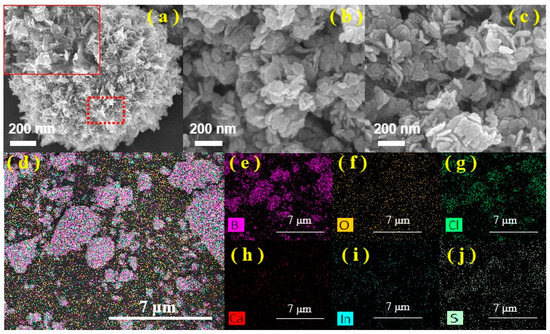 The morphologies of CaIn2S4, BiOCl, and the 1% CIS/BOC-SOVs heterojunction composite were also investigated, and the results re given in Figure 4. Pure CaIn2S4 (Figure 4a) exhibits a three-dimensional spherical shape and is composed of a large number of stacked two-dimensional nanosheets, which is consistent with previous reports [45,46,47,48]. BiOCl (Figure 4b) has a special nanosheet-like morphology, but obvious agglomeration can be noted. After solveothermal reaction (Figure 4c), BiOCl and CaIn2S4 were successfully combined into a 2D/2D heterojunction structure by in-situ growth, which maintained a morphology similar to BiOCl. The corresponding EDX mapping images (Figure 4d–j) indicate that a total of six elements, i.e., Bi, O, Cl, Ca, In, and S, are uniformly distributed on the sample surface. TEM was employed to further analyze the microstructure of the samples. The TEM images shown in Figure 5a,b reveal a spherical structure composed of nanosheets for pure CaIn2S4, which is the same result as obtained by SEM. In Figure 5c, a two-dimensional lamellar structure attributed to BOC-SOVs can be observed. The high-resolution TEM image of 1% CIS/BOC-SOVs (Figure 5d) shows the formation of a two-dimensional nanosheet structure. The lattice spacing of 0.266 nm and 0.327 nm is assigned to BiOCl and CaIn2S4 belonging to (102) and (311) crystal planes, respectively (Figure 5e) [50,51]. The existence of BiOCl and CaIn2S4 at a visible interface (Figure 5f) reveals the successful preparation of the 2D/2D heterojunction.