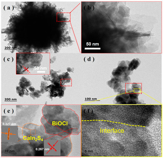 TEM image of (a,b) CaIn2S4, (c) BOC-SOVs, (d–f) 1% CIS/BOC-SOVs.