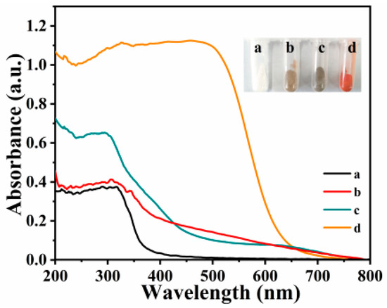 UV-Vis DRS of (a) pure BiOCl, (b) BOC-SOVs, (c) 1% CIS/BOC-SOVs, and (d) pure CaIn2S4.
