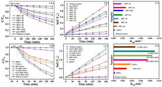 During the past few decades, with the rapid development of modern industrial and agricultural technology, energy and environmental issues have become important topics on a global level [1,2,3,4]. The treatment of sewage, which is a cause for widespread concern, has become the top priority of environmental protection work. Sewage can be differentiated according to the pollution source: industrial wastewater, non-recyclable water used in life, and sewage caused by commercial development. Industrial wastewater is the most harmful, in which the concentration of organic matter has gradually increased, and whose components have become increasingly complex, resulting in a more difficult degradation process and in challenging and often unsuccessful removal efforts by a number of applied technologies. Consequently, new sewage treatment technologies need to be developed. The removal of highly toxic and persistent organic pollutants contained in wastewater by employing semiconductor photocatalysis technology can be used as an attractive method to solve the problem of environmental water pollution. This technology has demonstrated unique advantages, including high efficiency, favorable economy, green and sustainable aspects, and environmental protection [5,6,7,8,9,10,11,12]. Therefore, it is particularly important to develop a photocatalyst with high catalytic performance in the degradation of pollutants in sewage. As a valuable p-type photocatalyst, bismuth oxychloride (BiOCl) has been extensively studied due to its good acid and alkali resistance, strong photostability, non-toxicity to organisms, simple preparation, and its functionality as a relatively positive valence band oxidation site. However, pure BiOCl cannot absorb visible light due to its wide bandgap and exhibits poor solar energy utilization in practical applications [13,14,15]. Therefore, the important question in current investigations has emerged on how to effectively broaden the response to visible light and realize the improvement of the visible-light photocatalytic activity of BiOCl [16,17,18,19]. Recently, many modification methods have been devoted to address these problems, such as modifications to generate surface oxygen vacancies (SOVs) and the construction of a compact heterojunction structure. The introduction of SOVs in photocatalysts through high-temperature calcination treatment resulted in some positive and unexpected results for the visible-light photocatalytic performance [20,21,22,23,24]. Fu et al. reported an improved photocatalytic activity by, i.a., narrowing the bandgap through introducing SOVs on bismuth molybdate (Bi2MoO6) grafted with Fe(III) clusters via a reliable calcination process combined with an impregnation approach. Lu et al. [8] used a simple in-situ modified sol-gel method to synthesize single crystals of mesoporous C-doped titanium dioxide (TiO2) with oxygen vacancies, in which the presence of oxygen vacancies led to a low carrier recombination rate and enhanced carrier separation, which finally promoted the degradation of organic pollutants. A resemblance was gained for BiOCl in Gao’s group.