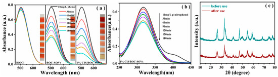 The loading amount of CaIn2S4 emerges as another very important factor for the photocatalytic activity of the material. The performance of heterojunction catalyst constructed on the basis of calcination treatment is shown in Figure 8d–f. As evident from the results, 1% CIS/BOC-SOVs showed a higher activity than the other prepared catalysts. The amount of degraded phenol increased to 81.8%, and its apparent rate constant (Kapp/min−1) improved by a factor of 32.8, 3.2, and 2.47 compared with pure BiOCl, BOC-SOVs, and CaIn2S4, respectively. The enhanced photocatalytic activity of the BiOCl-SOV-CaIn2S4 heterojunction can be attributed to the synergistic effect between oxygen vacancies and the 2D/2D heterojunction. As evident from Figure 9a, the synthesis of the heterojunction significantly improved the photocatalytic degradation of phenol by BiOCl. In addition, the UV-Vis absorption spectra (Figure 9b) recorded during the oxidative degradation of p-nitrophenol indicate a certain but slow degradation catalyzed by CIS/BOC-SOVs. A photostability test of the catalyst was performed by the cyclic degradation of phenol. In the XRD pattern displayed in Figure 9c, no obvious new peaks or significant decrease in intensity are observed after the cycle test, which proves the durability of the prepared material.