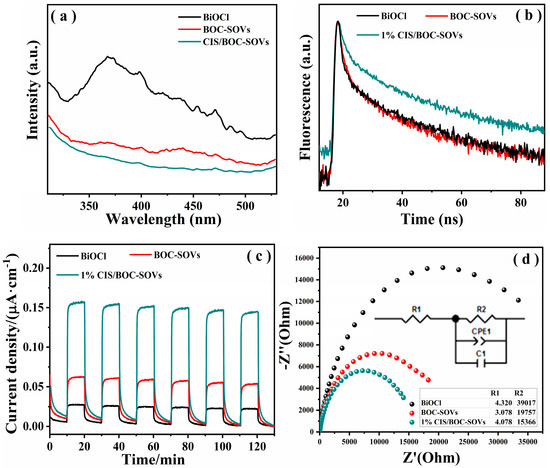 (a) Photoluminescence spectra, (b) Time-resolved fluorescence decay spectra, (c) Transient photocurrent response, and (d) Electrochemical impedance spectroscopy of BiOCl, BOC-SOVs, and 1% CIS/BOC-SOVs.