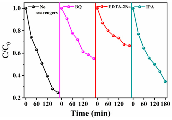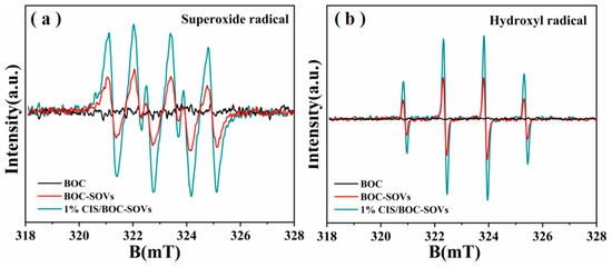 The catalyst with heterojunction demonstrates an outstanding photocatalytic activity for phenol degradation, which may be attributed to the generation of free radicals and holes with strong oxidation ability during photocatalytic degradation. As shown in Figure 11, the presence of IPA and TEA or BQ capture agent caused different inhibitory effects on phenol degradation, which increased in the order EDTA-2Na, BQ, and IPA. In-situ ESR technology was used to detect the free radicals generated during the photocatalytic reaction (Figure 12). The characteristic peaks of DMPO-·O2- and DMPO-·OH are not detected with pure BiOCl under visible-light irradiation, but the existence of ·O2- and ·OH radicals is confirmed for both BOC-SOVs and 1% CIS/BOC-SOVs. It is worth noting that the spectra for the heterojunction catalyst show higher free-radical signal intensities than that of BiOCl and BOC-SOVs. The capture test and the ESR results confirm that the active species involved in the photodegradation of phenol are mainly hydroxyl radical, superoxide radical, and hole [52,53].