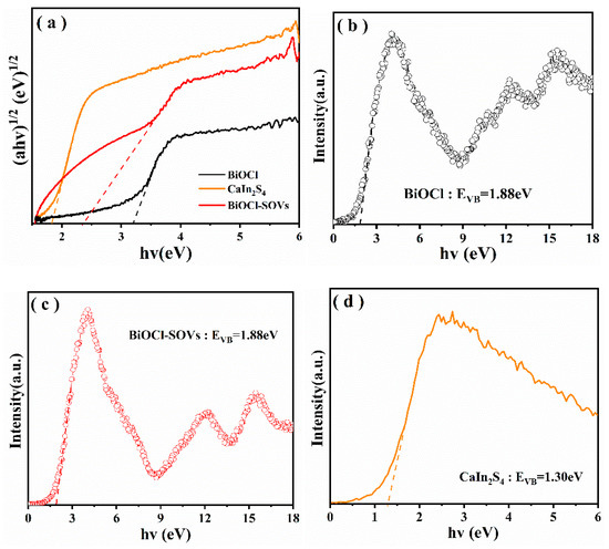 (a,b) The corresponding Tauc curves of BiOCl, BOC-SOVs, and CaIn2S4, and (c,d) VB spectra of the BOC-SOVs and CaIn2S4.