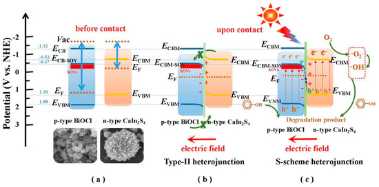Accordingly, a reasonable photocatalytic mechanism can be proposed as follows. The calculated bandgaps of BOC-SOVs and CaIn2S4 are 2.35 V and 3.20 V, respectively (Figure 13a), while the valence band edge values obtained from the XPS valence band (VB) spectra are 1.88 and 1.30 V (Figure 13b–d), respectively. Finally, the conduction band (CB) edge values are −0.47 and −0.53 V, respectively, as calculated by subtracting the bandgap value from the VB edge value (Table 3). The S-scheme mechanism of photo-generated carrier transfer of CIS/BOC-SOVs heterostructures is proposed based on experiment and theoretical calculation results. As shown in Scheme 1, before the contact, the Fermi level (EF) of p-type BiOCl is about 0.3 V above VB, while the Fermi level (EF) of the n-type semiconductor CaIn2S4 is about 0.3 V below CBM. Because the energy of BiOCl from EF to the vacuum level is greater than that of CaIn2S4, BiOCl is negatively and CaIn2S4 is positively charged on opposite sides, so that electrons flow from CaIn2S4 to BiOCl following the direction of the electric field. When the two materials contact each other to form a heterojunction, the VB of BiOCl moves upward and the CB of CaIn2S4 moves in the opposite direction to achieve the Fermi level equilibrium (EF) of BiOCl and CaIn2S4, thus theoretically forming a typical S-scheme heterojunction instead of a type-II heterojunction [33,49]. When the heterojunction is irradiated by visible light, electrons in BiOCl with a relatively positively charged potential and holes in the VB of CaIn2S4 with a relatively negatively charged potential are simultaneously transferred to the oxygen vacancy state of BiOCl near the CB and then rapidly recombined. Finally, the VB of BiOCl with strong oxidation ability and the CB of CaIn2S4 with strong reduction ability are retained. Therefore, compared with the type-II heterojunction, the S-scheme photocatalyst can utilize the redox capability of the photocatalyst to its maximum.