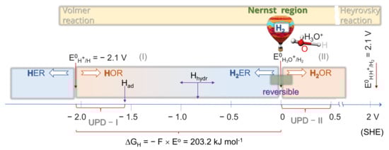 Thermodynamics of atomic (HER/HOR) and molecular hydrogen (HER/HOR) processes in the potential range between Volmer and Heyrovsky reactions. The underpotential deposition regions UPD-I and UPD-II correspond to adsorption of and H3O+/H, respectively. The width of regions was evaluated on the basis of 50 kJ mol, which is the energy of hydrogen adsorption on Pt reported in the literature []. stands for surface hydrides, formation of which can depolarize the discharge of . The molecular hydrogen evolution and oxidation reactions (HER/HOR) are reversible on a Pt electrode in the vicinity of 0 V denoted as Nernst region.