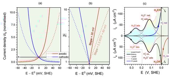 These polarization curves for the anodic and cathodic processes are shown in Figure 2a,b, whereas Figure 2c depicts polarization curves of surface electrochemical processes, taking place on the Pt electrode surface in the so-called hydrogen UPD region at V (SHE). Thus, in the case of hydrogen evolution process, the slope is equal to the slope ; therefore, it is referred to as the Nernst slope in this study.