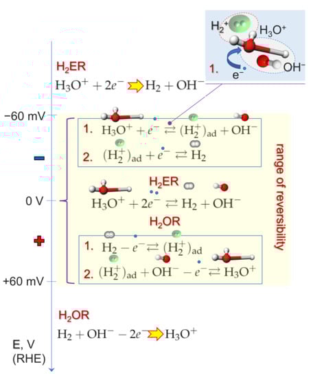 Reversibility is discussed next since the presented HER/HOR processes are based on the reversible mechanism (Figure 3). Reversibility is key for thermodynamic analysis and it is essential for existence of the SHE and RHE electrodes. In contrary to full reversibility, the Tafel rate equation defines kinetics of reaction dependent on overpotential, i.e., it is irreversible and non-equilibrium. The Tafel’s analysis of I-V characteristic’s slope from overpotential [] has become a corner stone for analysis of efficiency of electrochemical processes. The phenomenological Butler-[] and Volmer-[] model of electrode kinetics fits the Tafel’s current-voltage analysis and describes interface processes in a microscopic per particle manner. Cases of non-equilibrium thermodynamics encountered at interfaces of fuel cells and batteries, e.g., intercalation, are actively investigated and their reversibility has paramount practical importance []. Kinetics of charge transfer on an electrode surface is inherently related to the hydrodynamics of reacting species. It is experimentally established that H3O+ diffuses twice faster than OH in water, which was explained by ab initio calculations [] as due to the Grotthuss mechanism dominating over hydrodynamics. Different 3D arrangement of possible proton docking sites is responsible to different probabilities of O–H bond switching. The slower diffusion of OH at nanostructured electrocatalytic surfaces is consistent with mV/dec slope observed experimentally for hydrogen evolution reaction. Other processes such as oxidation/reduction of the electrode, adsorption, chemical reactions and hydrodynamics all can have a contribution to kinetics of HER/HOR, especially in the non-reversible region of potentials (Figure 3).