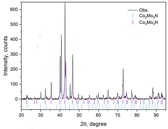 The literature considering the early studies of cobalt molybdenum nitride catalysts indicates that the compound described by Co3Mo3N stoichiometry is expected to be the only ternary nitride obtained after ammonolysis of the precursor [15]. Metallic cobalt and molybdenum nitride, Mo2N, were observed as intermediates and as decomposition products after prolonged gas and heat treatment [7,15,31]. However, in our previous studies [18,19,20,21] the occurrence of two cobalt molybdenum nitrides: Co3Mo3N and Co2Mo3N was observed. Unlike previous reports by Kojima and Aika [24], the decomposition products (metallic cobalt or molybdenum nitride Mo2N) were not observed after the thermostability test. Earlier reports indicate that the formation of the Co2Mo3N phase required special treatment [32]. However, a detailed review of older reports indicated that the Co2Mo3N phase also occurred after ammonolysis, but was not adequately identified [33].