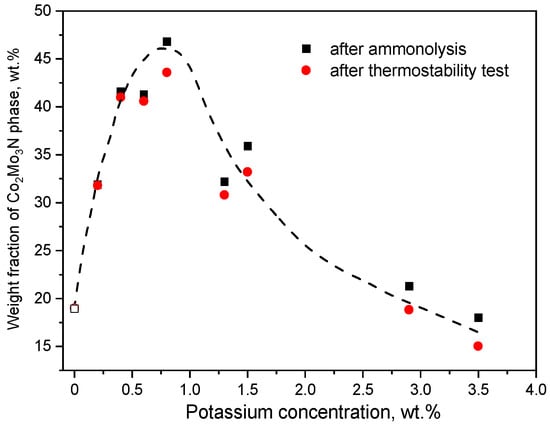 Catalysts based on the mixture of Co3Mo3N and Co2Mo3N phases are highly active in the process of ammonia synthesis. Admixture of potassium compounds promotes the catalytic activity. Additionally, the phase composition of the catalysts is affected by the potassium content. After the thermostability test, the potassium-free catalyst remains virtually unchanged. Potassium-promoted catalysts lose catalytic activity as a result of the decrease of their surface area. The characteristic shape of the relation between potassium concentration and all of the measured parameters was observed for fresh catalysts as well as after the thermostability test. The maximum of the surface area and activity was observed for the catalysts with the greatest concentration of the Co2Mo3N phase, around 0.8–1.3 wt.% of potassium.
