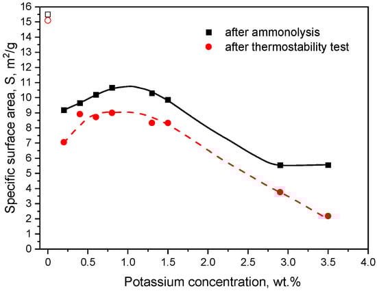 The specific surface area is an important factor that influences the catalytic properties of the catalysts. During the present study, this parameter was measured twice for all of the catalysts: after ammonolysis and after thermostability test. The results are depicted in Figure 3. The specific surface area of fresh, non-promoted COMON catalyst is 15.5 m2/g, a value typical for many carrier-free metallic catalysts [29,30]. The surface area of the remaining catalysts depends on the concentration of potassium. It amounted to 9.2 m2/g for the fresh catalyst containing 0.2 wt.% of potassium and increased in the range of potassium concentration between 0.4 wt.% and 0.8 wt.%. The maximum was observed at 0.8 wt.% of potassium and amounted to 10.7 m2/g. A further increase of potassium concentration resulted in a decrease in the specific surface area. The most prominent loss was observed for catalysts containing 2.9 wt.% and 3.5 wt.% of potassium, where the specific surface area measured was approximately 5.5 m2/g.